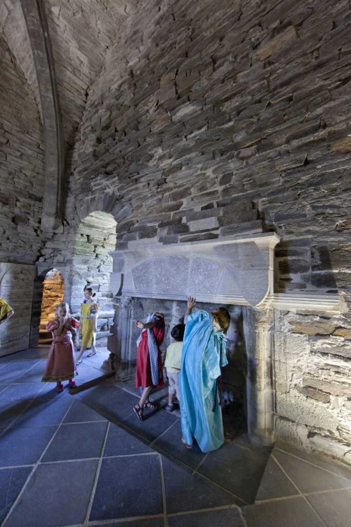 Dans les salles meublées de cette forteresse, la vie du Moyen Age devient plus qu’imaginable, en costumes et attablés dans la grande salle seigneuriale ou posé sur les coussièges et lits à baldaquin des chambres des étages …