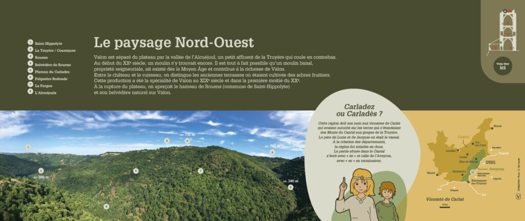 Suivez les panneaux, Roger né et habitant à Valon vous y raconte une vie ancienne, pas si lointaine où les habitants de Valon tiraient parti de la nature qui les entourait pour y vivre.C’est à voir et à faire en suivant sur le sentier de découverte des Coultades.